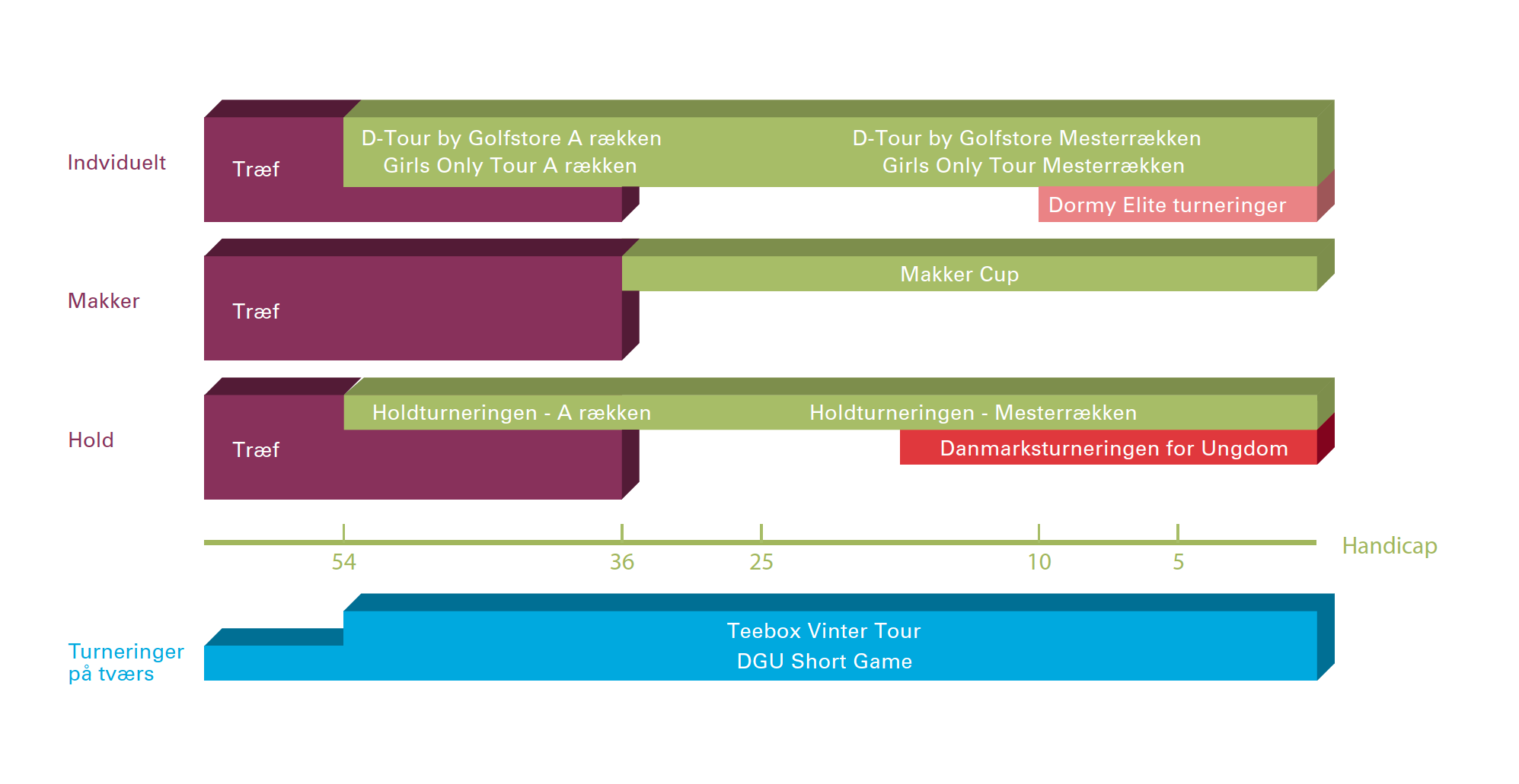 I 2020 implementerede Dansk Golf Union en ny aktivitets- og turneringsstruktur for U25 spillere. Denne struktur sikrer, at der er et turneringstilbud til alle børn og unge uanset alder og niveau. Turneringerne er tilpasset det enkelte barn, således at det bliver sjovt, udviklende og fyldt med gode oplevelser at spille turneringsgolf.